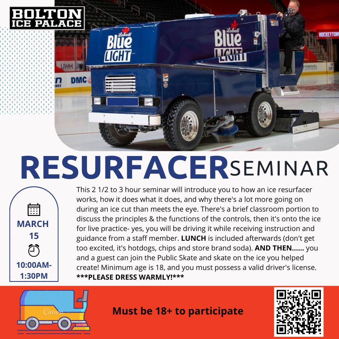 This 2 1/2 to 3 hour seminar will introduce you to how an ice resurfacer works, how it does what it does, and why there's a lot more going on during an ice cut than meets the eye. There's a brief classroom portion to discuss the principles & the functions of the controls, then it's onto the ice for live practice- yes, you will be driving it while receiving instruction and guidance from a staff member. LUNCH is included afterwards (don't get too excited, it's hotdogs, chips and storebrand soda). AND THEN...... you and a guest can join the Public Skate and skate on the ice you helped create! Minimum age is 18, and you must possess a valid driver's license. ***PLEASE DRESS WARMLY!***